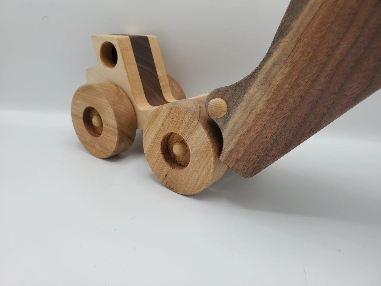 When you need to handle the really big loads, this is the truck you want. The main body is a hefty 2 1/4" wide and constructed from layered Maple and Walnut. The fully functional bed is solid Walnut, and the 3" wheels are solid Birch. Overall length is 9”, height is 5 1/4”, and width is 4 1/4”. The truck is finished with a non-toxic mineral oil and beeswax paste.